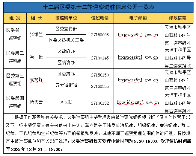 近日,根据区委巡察工作统一部署,承担十二届区委第十二轮巡察任务的4个区委巡察组全部完成进驻。本轮巡察对区委宣传部、区委编办、区委区级机关工委、区文联、区政府办、区信访办、五大道街道7个单位党组织开展常规巡察。常规巡察期间,同步开展选人用人工作、落实意识形态工作责任制、机构编制纪律专项检查。