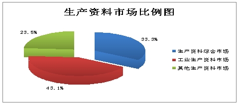 (一)按类别划分。在全市各类市场中,消费品市场425个,占88.2%;生产资料和生产要素市场57个,占11.8%。在消费品市场中,消费品综合市场占主体,为56%,农副产品综合市场占33.9%(见图一)。在生产资料市场中,工业生产资料市场占主体,为43.1%(见图二)。