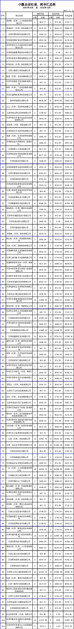 2021年10月小微企业享受社保、岗位补贴公示名单