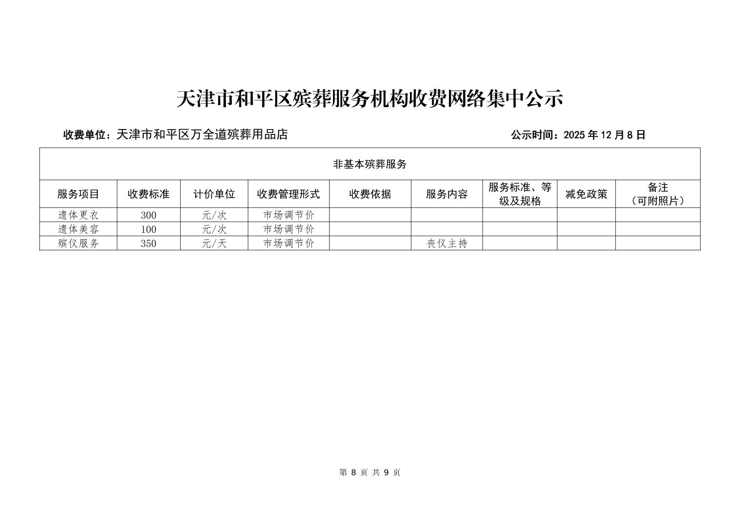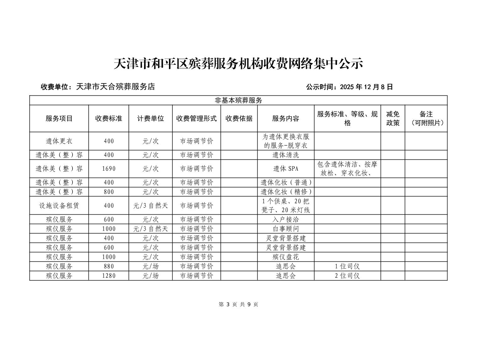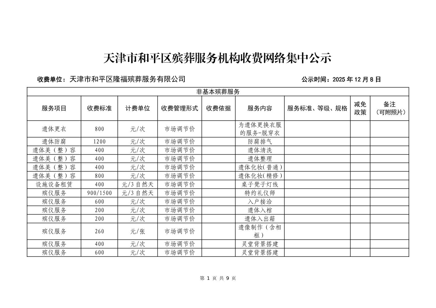 天津市和平区殡葬服务机构收费网络集中公示-非基本殡葬服务价格